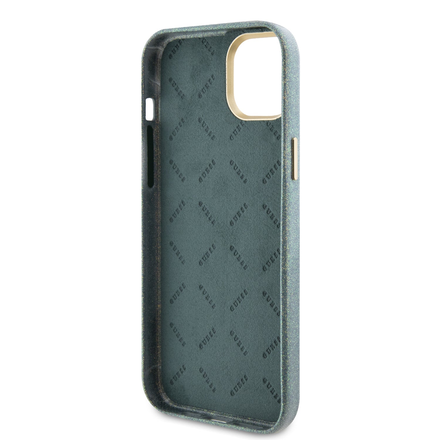This original Guess iPhone 15 case has a unique, eye-catching design. The back has a unique mirrored lilac finish with numerous individual facets. The gold-tone Guess logo adorns the case and matches the gold-tone ring around the camera.