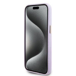 This original Guess iPhone 15 case has a unique, eye-catching design. The back has a unique mirrored lilac finish with numerous individual facets. The gold-tone Guess logo adorns the case and matches the gold-tone ring around the camera.