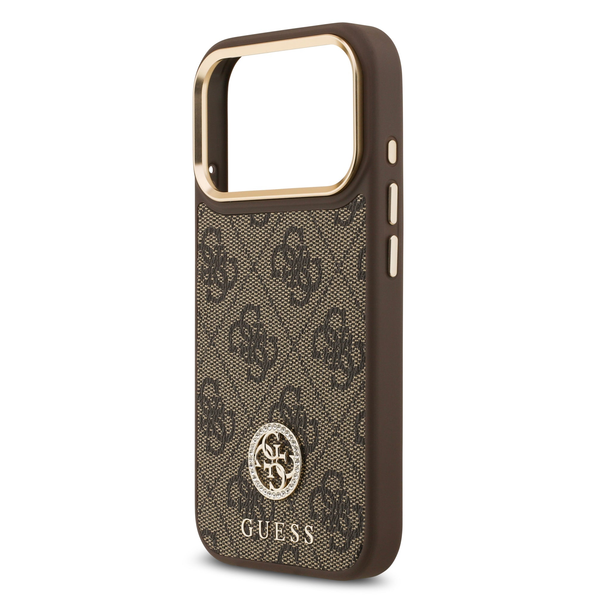 At the bottom of the case, there is a decorative Guess 4G emblem adorned with sparkling crystals, complemented by the subtle Guess logo.