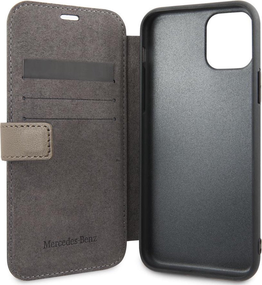 Because the Mercedes iPhone 11 Pro case was custom-made especially for this device, the fit is optimal. The case takes into account all keys, the connection remains free, as do the cameras. Even wireless charging remains possible while your iPhone is in this Mercedes-Benz case. The phone case also adds extra functionality in the form of 3 compartments for cards and a handy stand.