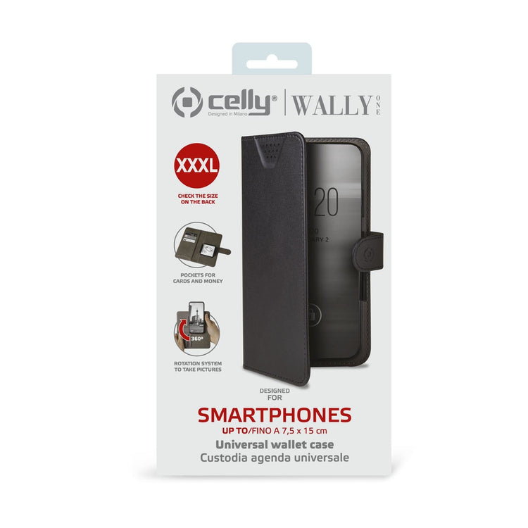 One case for all smartphonesWALLY ONE is the universal wallet case, available in three different sizes, which thanks to the universal fixing system it will fits to any type of phone. The 360°rotating system allows you to take photos and videos with a simple movement. Make calls with the closed case thanks to the hole placed in the front of the case. The magnetic closure will keep your smartphone safe into the case. Compatibile with different models of Smartphone: Apple, Samsung, Motorola, Xiaomi, OPPO, Huawei, TCL, Alcatel . Vivo, Realme, Honor.